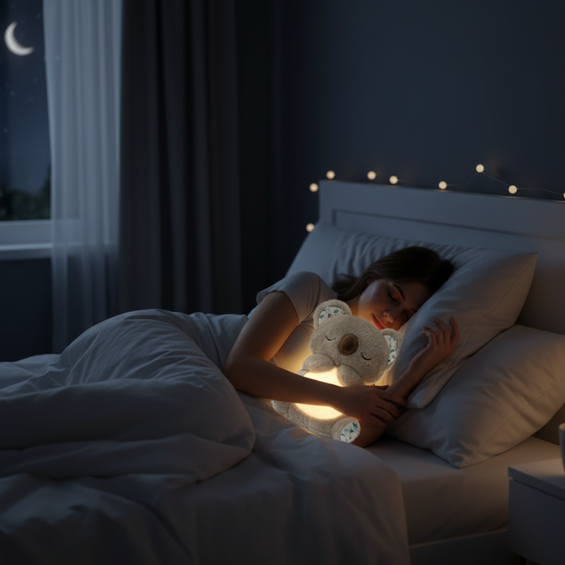 Der Calm Koala vereint sanfte Bauchbewegung, warmes Licht & rhythmische Atmung zu einem wohlfühlenden Begleiter für Körper und Geist. Er vermittelt Geborgenheit, Ruhe und Entspannung – ganz ohne Chemie.